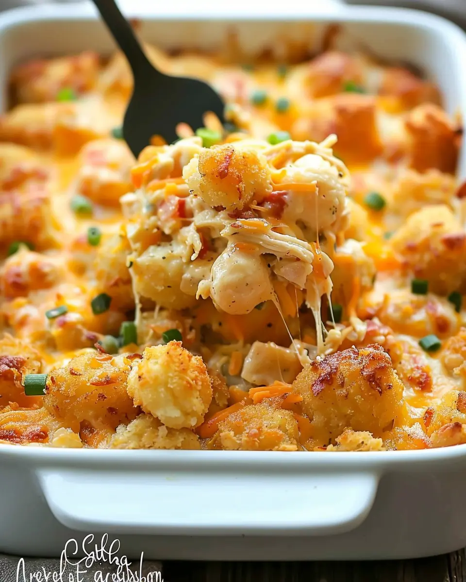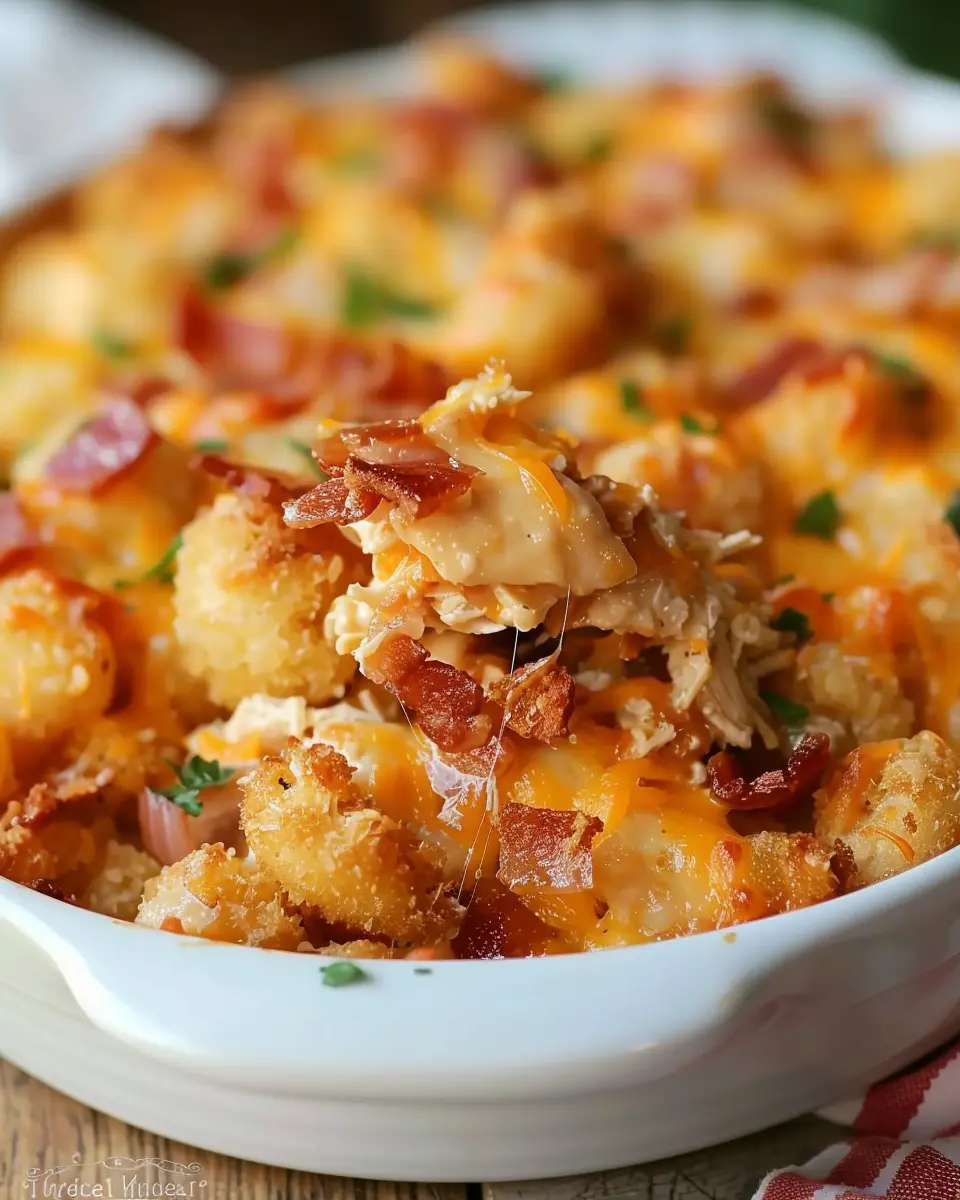 A delicious casserole combining chicken, tater tots, and turkey bacon for a comforting meal.