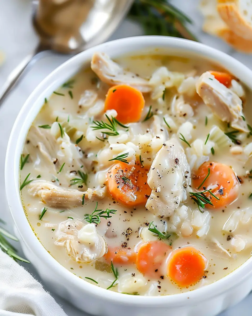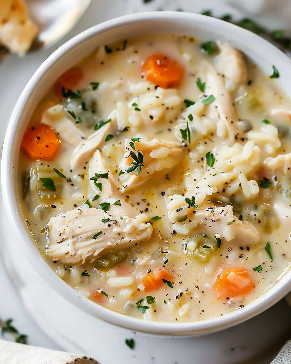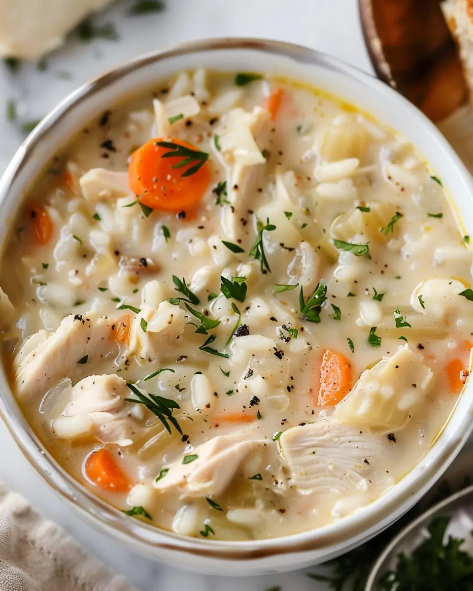 A warm and comforting creamy chicken and rice soup that is perfect for chilly days.