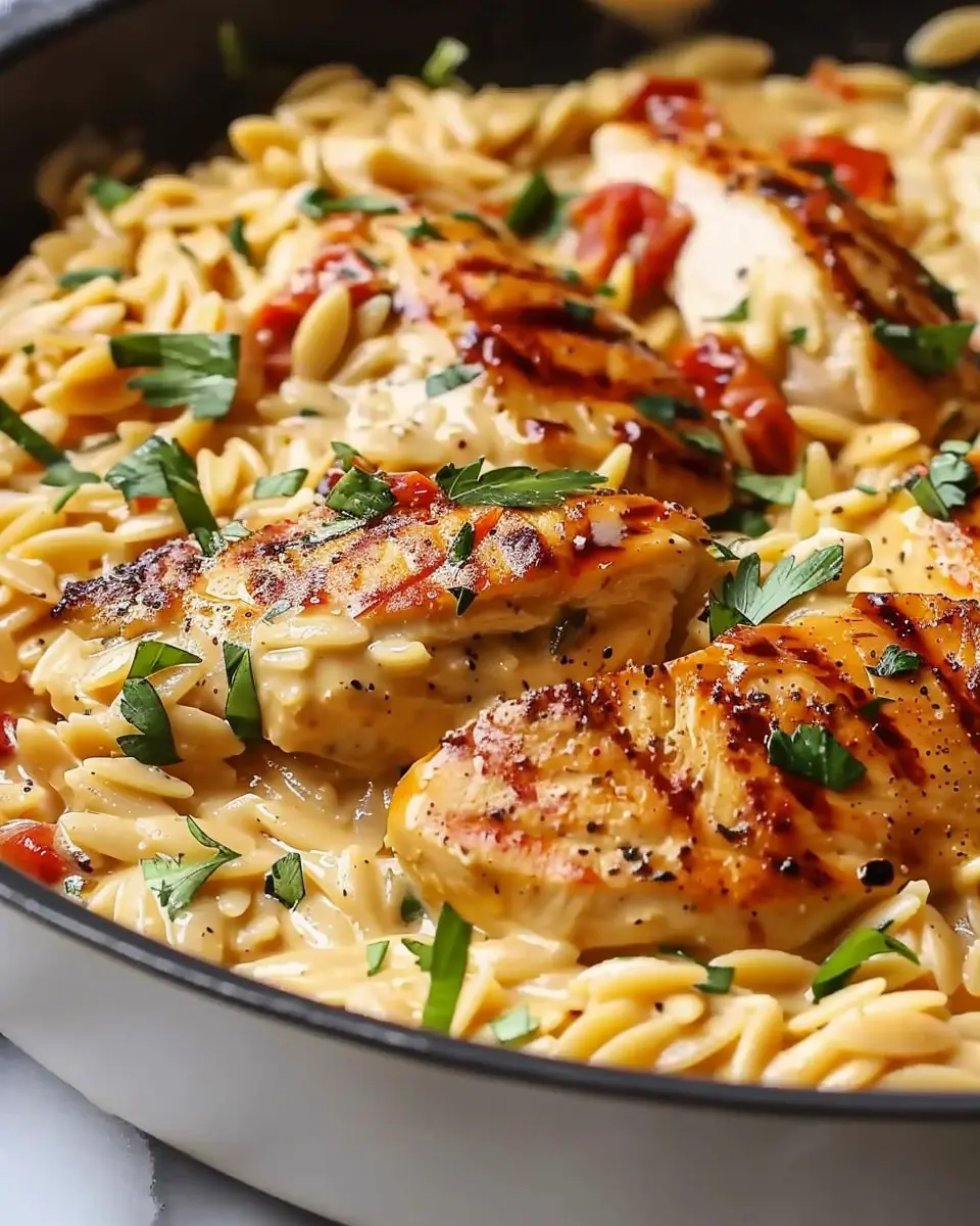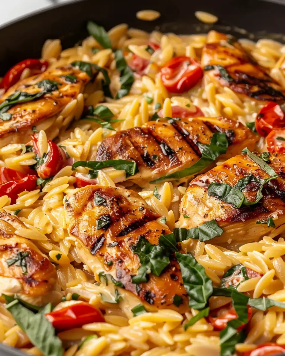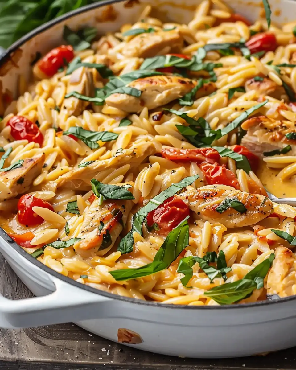 This Creamy Tuscan Chicken Orzo is a delicious and comforting dish that combines tender chicken, fresh spinach, and orzo pasta in a rich, creamy sauce.