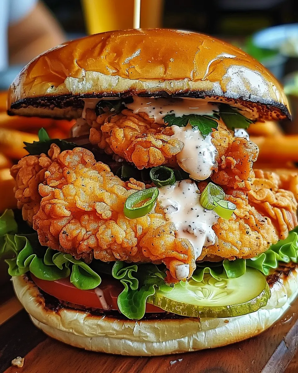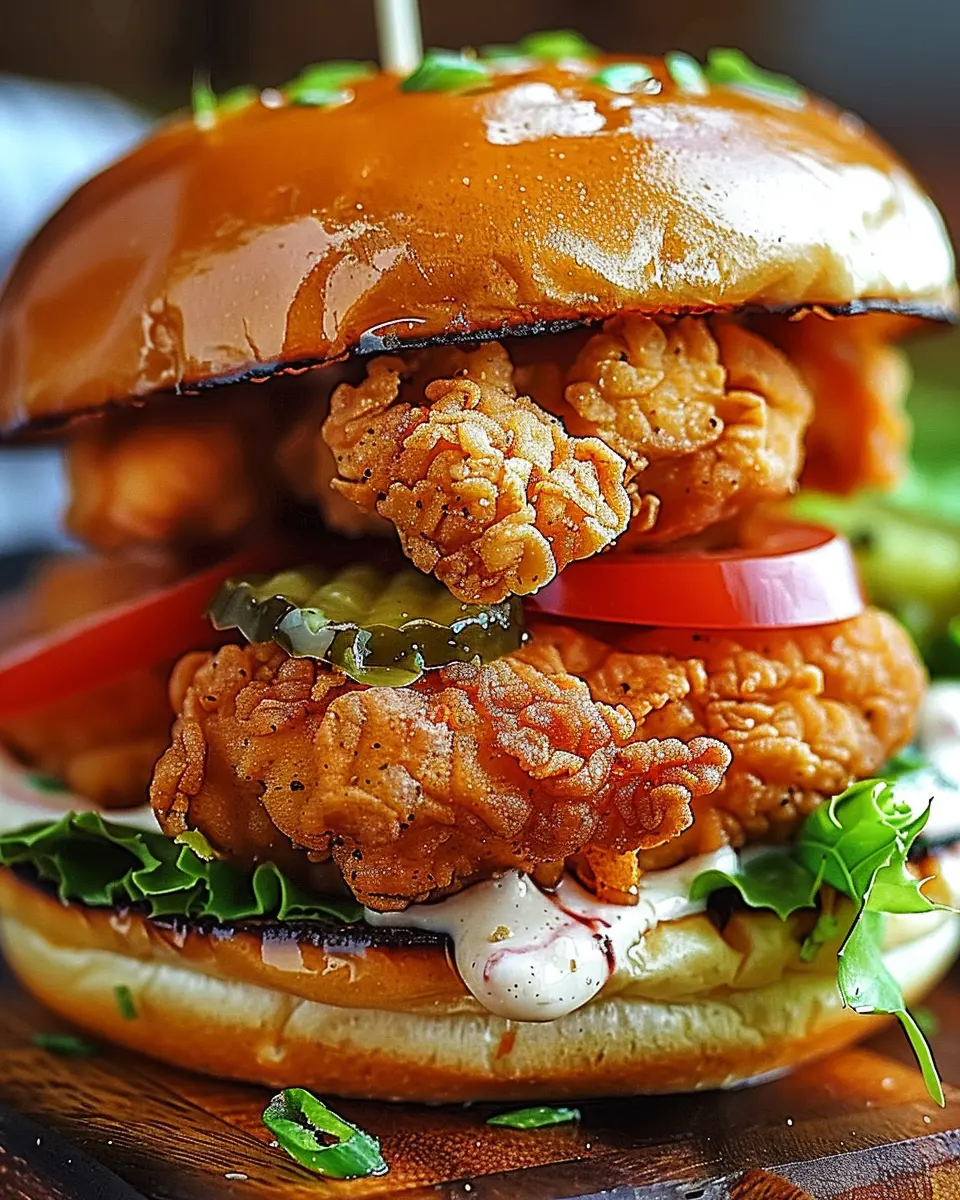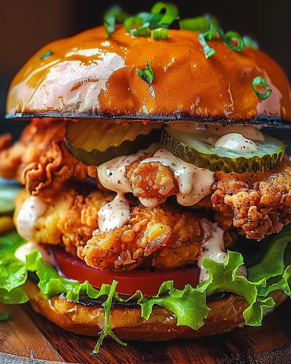 • Start with the bottom bun, add a piece of crispy fried chicken, top with your favorite fixings—think crunchy pickles, a slice of cheese, or even some turkey bacon for added flavor.
