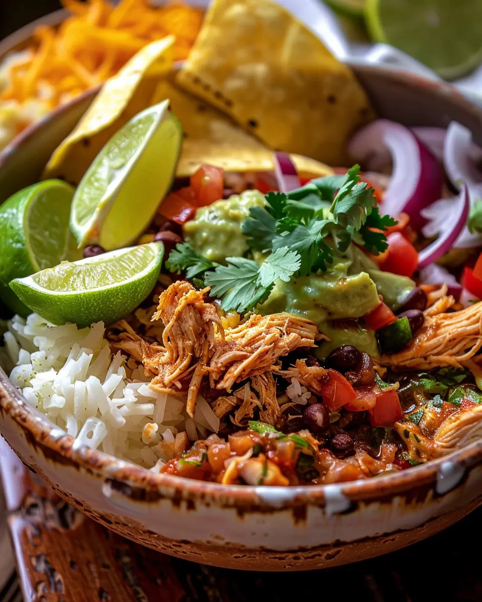 Finally, the pièce de résistance—let’s assemble your Crockpot Salsa Verde Chicken Tortilla Bowl!