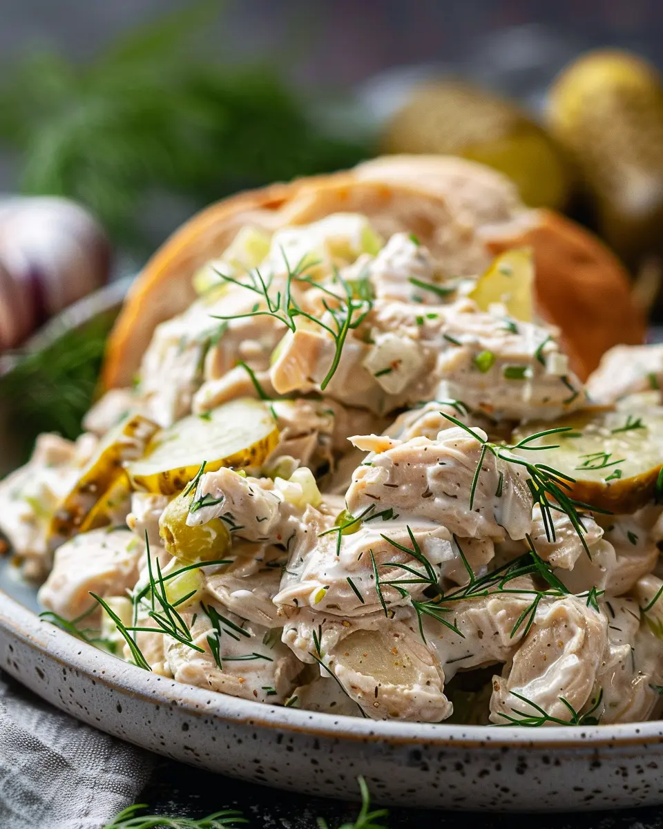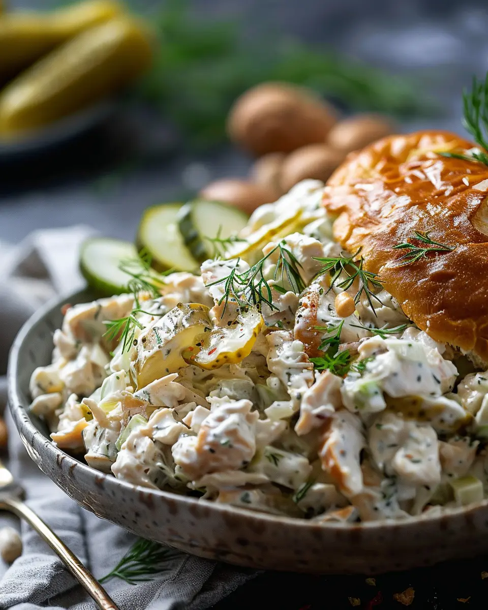 A delightful and refreshing chicken salad featuring crunchy dill pickles and savory turkey bacon.
