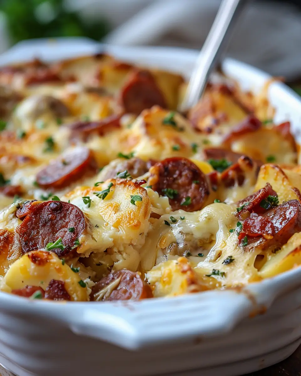 What makes this dish so irresistible? For starters, its versatility means it fits perfectly into any weeknight meal or festive gathering. You can whip it up quickly on a busy Tuesday or serve it as a showstopper at your weekend dinner party. It combines the hearty flavor of kielbasa sausage with comforting potatoes and a rich layer of cheese, creating a symphony of textures and flavors.