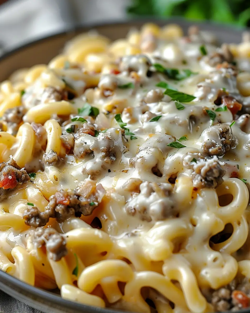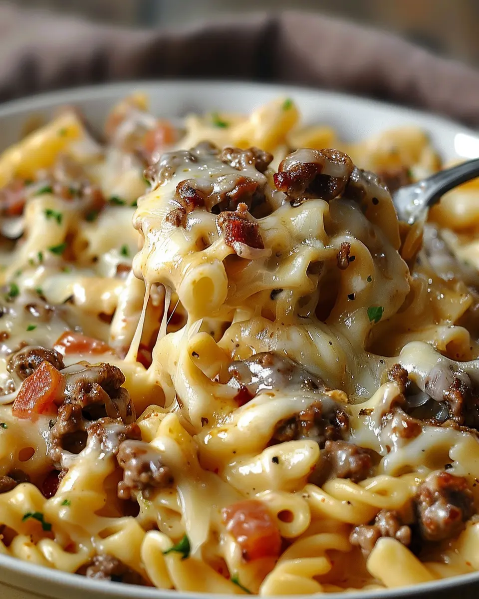 A creamy and rich pasta dish that combines the flavors of cheeseburgers and Alfredo sauce, perfect for a comforting meal.