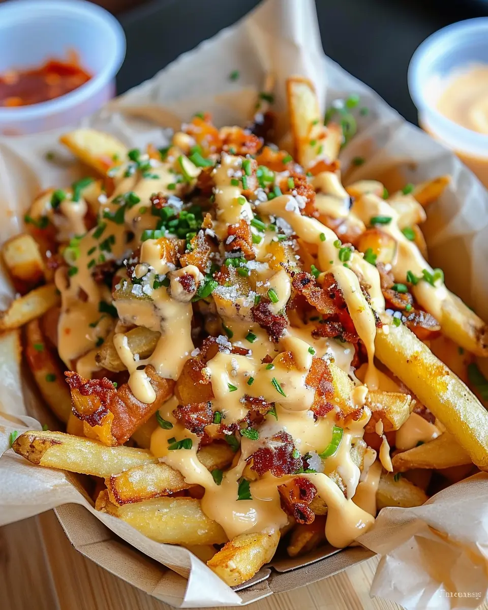 Now that your fries are all dressed up and ready, it’s time to serve them warm. Pair them with a cold beverage—a refreshing iced tea or a fizzy soda complements this dish beautifully. You’ve put in the effort, and now it’s time to indulge! Set these fries in front of your friends, and prepare for their oohs and aahs.
