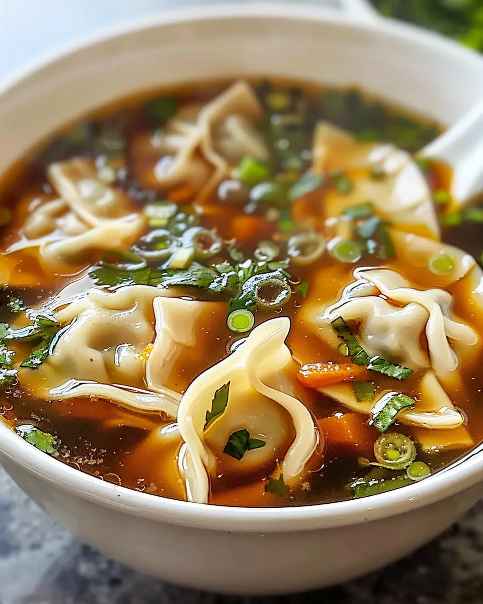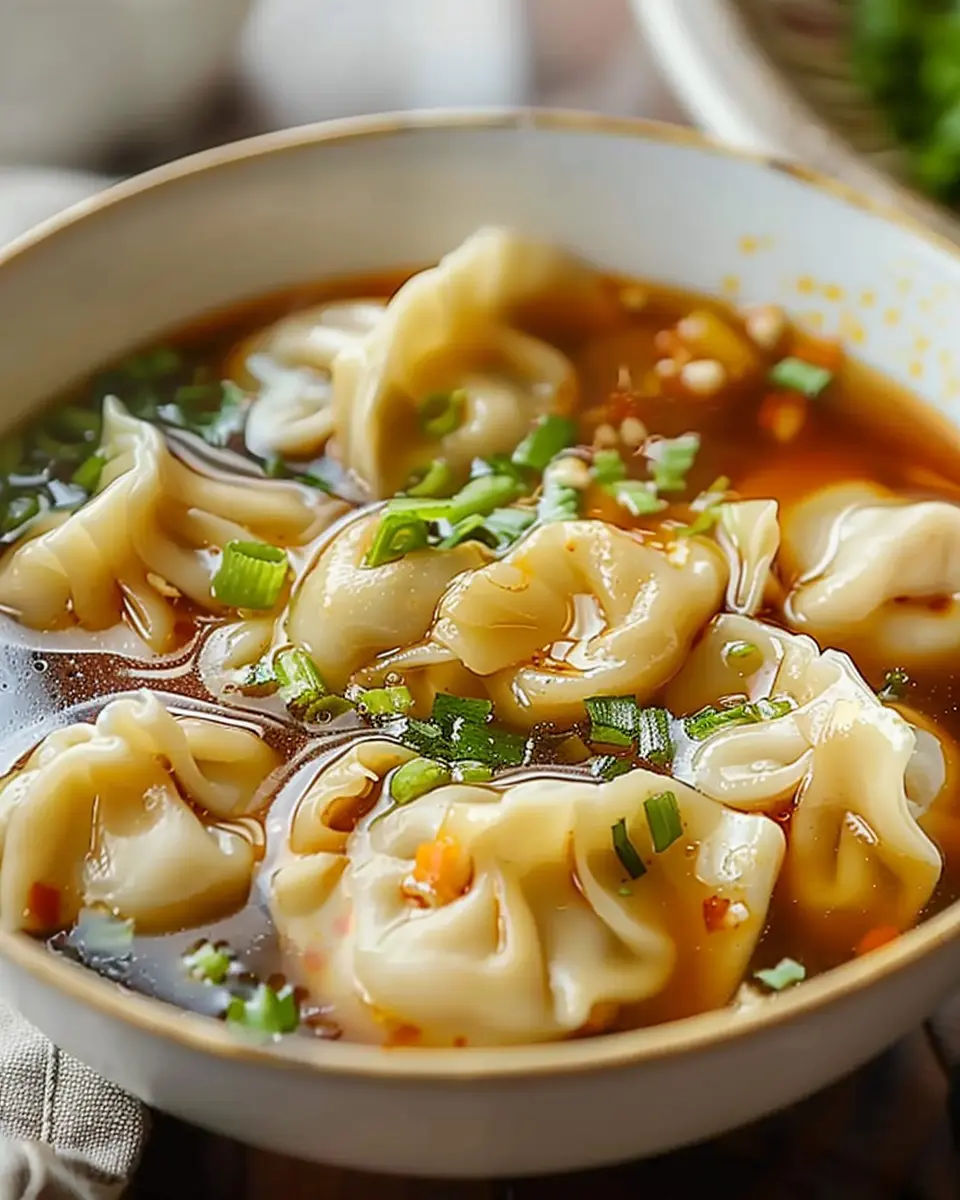 Potsticker Soup is a comforting bowl of goodness, combining savory turkey bacon and beef for a delicious meal.